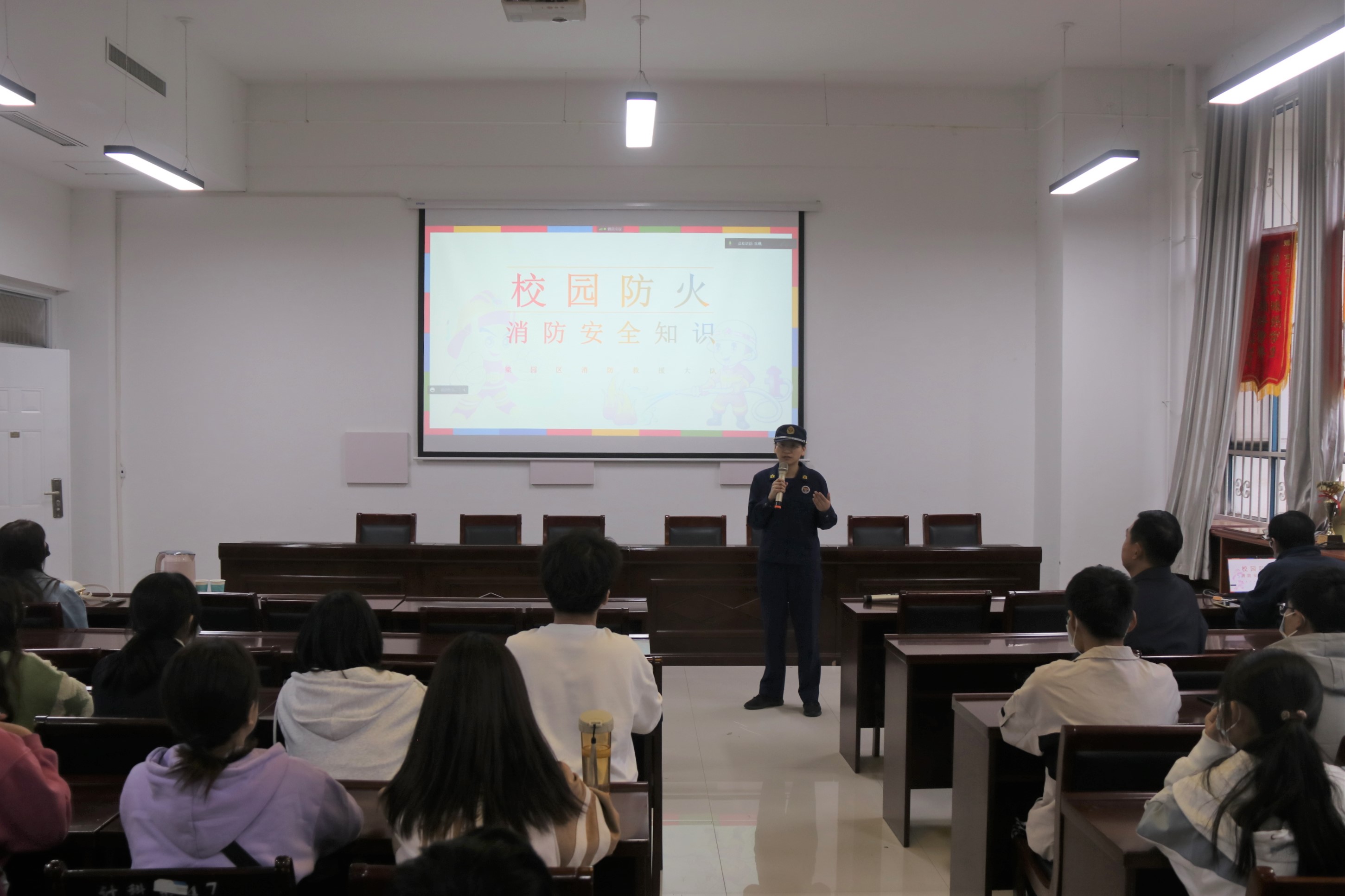 朱教官围绕“预防为主,防消结合”的原则,分别从校园防火、用火知识,灭火器的使用方法,宿舍及教室等不同火灾场景如何正确开展安全疏散与逃生的知识等内容向同学们进行深入浅出的讲解。