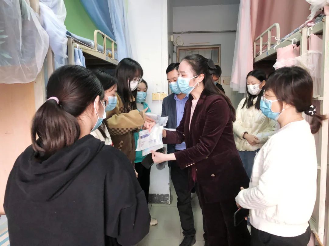 学院领导给宿舍学生发放卫生打扫用具和防疫物资