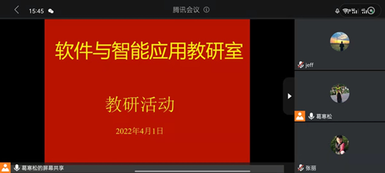 4月1日下午3:40,软件与智能应用教研室线上开展第三届中国计算机教育大会学习交流研讨活动,会议由教研室主任葛寒松主持。