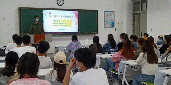 交流会上,2022届考研学生代表解圆圆、朱君豪首先向学弟学妹们分享了自己的考研经历和学习经验。解圆圆提醒学弟学妹们,考研的成功等于正确的方法加之不懈的努力以及恰当的学习资料。朱君豪则从“专业”、“英语”、“数学”、“政治”四方面就如何考研这一问题深入剖析,他叮嘱学弟学妹们要仔细研究真题题型,明确考察目的,不断总结适合自己的学习方式方法。随后,在现场提问环节中,同学们积极踊跃地提出了自己心中的疑问,学长学姐也有针对性地逐一解答。