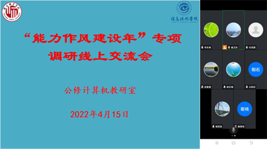 4月15日下午3点30分,公修计算机基础教研室借助腾讯会议召开“能力作风建设年”专项调研线上交流会,教研室主任崔卫东主持会议,教研室各位老师针对主题积极发言,气氛活跃。