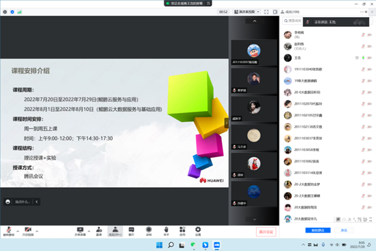 2022年7月20日,sunbet申搏与深圳市讯方技术股份有限公司联合培养的第三期鲲鹏产业学院暑期卓越班正式开课,本次培训共128课时,分为鲲鹏云服务与应用、鲲鹏云大数据服务与基础应用两门课程,sunbet申搏物联网工程、数据科学与大数据技术、软件工程、计算机科学与技术、电子商务专业共127名学生和4名老师参加了此次培训。