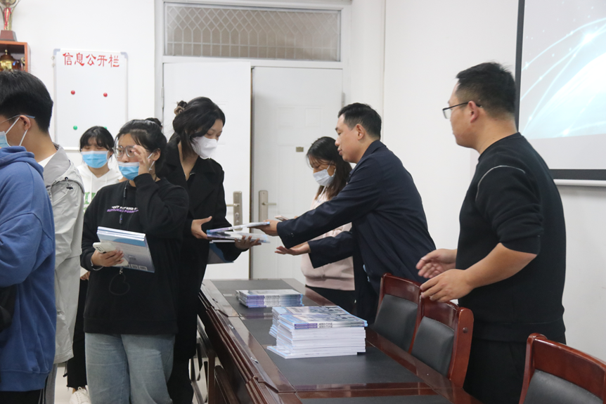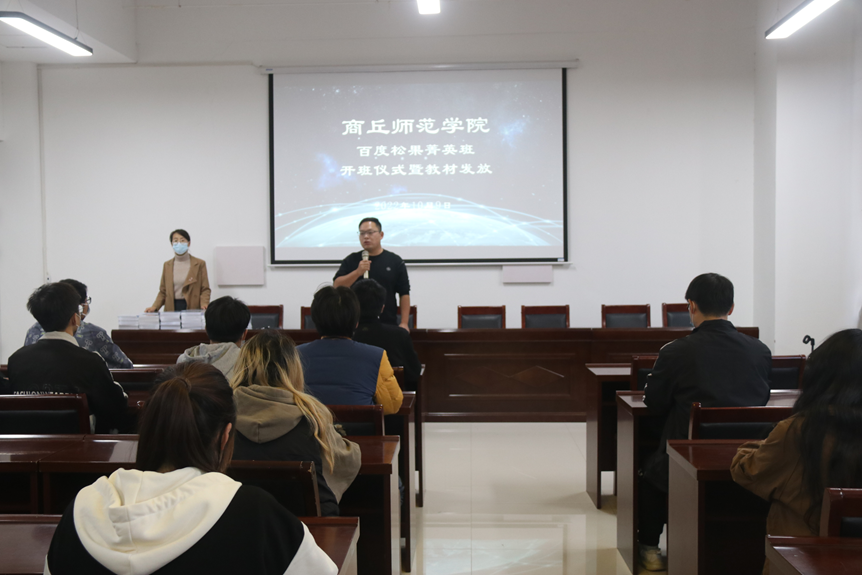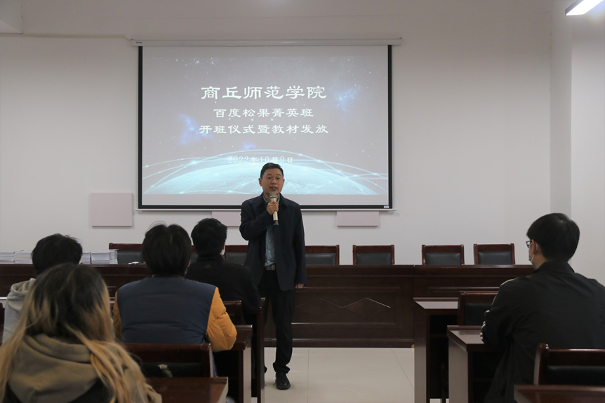仪式开始,刘佳首先向同学们表示祝贺,并详细介绍了此次菁英班的培养目标。他指出,sunbet申搏百度松果人才培养精英班是由学校和百度公司合作共建,目的是为了培养出更多创新性、应用型、技能型、复合型人才,也是学校不断推进高水平应用型大学建设的要求,希望同学们抓住机会,认真学习,以当代青年大学生的身份勇担时代使命,积极响应科技强国的号召,学好专业技能,以科技助力中华民族伟大复兴。随后王帅芳对精英班培养计划和课程安排进行详细解读,彭会锋则对班级管理和上课纪律进行要求。最后,三位老师共同为同学们发放了教材。