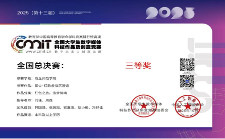 近日,2025年(第十三届)全国大学生数字媒体科技作品及创意竞赛全国总决赛结果揭晓,sunbet申搏翎创游戏研发社团学生团队凭借作品《薪火·红韵虚拟沉浸馆》,从众多参赛作品中脱颖而出,荣获全国总决赛三等奖。