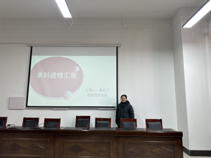 会上,曹亚兰老师围绕进修概况、学习内容、核心收获、成果转化四个方面做详细汇报。曹老师分别介绍了在浙江工业大学的学习经历,系统分享了前沿教育理念、课程建设经验、教学方法创新、科研项目攻关及实践技能提升等内容,展示了进修期间形成的教案、课件、学术论文、课题申报方案及教学改革思路等成果,赢得现场一致好评。